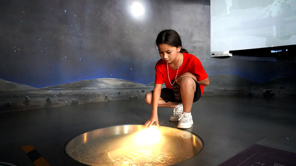 7月26日,和田地区皮山县乔达乡巴什乔达村小学学生阿依努尔·约麦尔阿卜拉在天文馆伸手触摸月球脚印模型。强继强 摄