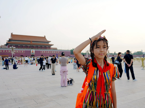 7月24日,努尔比耶姆·麦麦提敏在天安门广场敬礼。强继强 摄