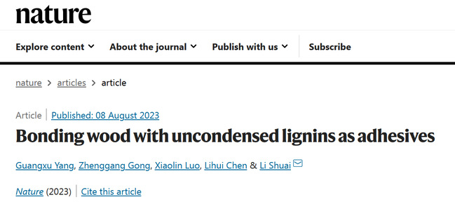 8月8日,国际期刊《自然》报道了福建农林大学帅李教授团队制备了新型绿色木质素胶黏剂的最新研究成果。这是该校生物质基功能材料研究中心在生物质资源高值化利用领域取得的重要突破。
