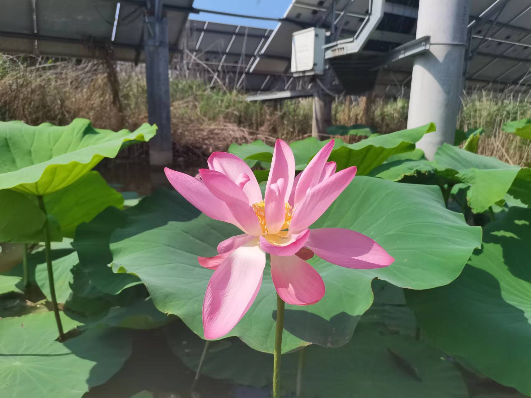 “渔光互补”模式下,莲花盛开。这是李华亭种植的“太空一号”莲藕。科技日报记者 王延斌 摄