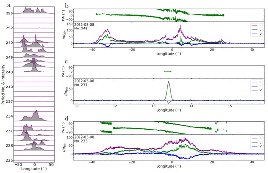紧接着,研究团队又对这颗脉冲星进行了两个小时的验证观测,获取了一百多个矮脉冲。这些脉冲在脉冲强度和宽度的分布上与正常脉冲有明显的区别,它们构成为一个独立的辐射族群。同时,FAST对这些矮脉冲进行了精确的偏振测量。结果表明,与正常脉冲相比,矮脉冲辐射区域的磁层结构基本没有改变,但矮脉冲更容易在高频波段流量变得很强。