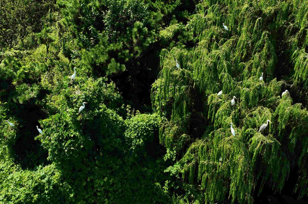 8月31日,在山东省青岛市城阳区丹山森林公园拍摄的栖息在树丛上的白鹭和苍鹭。王海滨 摄