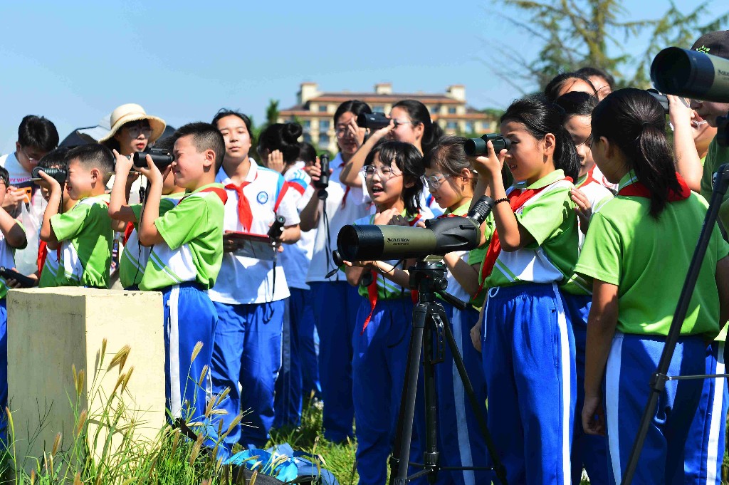 8月31日,在山东省青岛市城阳区丹山森林公园,来自夏庄街道丹山小学的学生在生态科普活动上观鸟。王海滨 摄