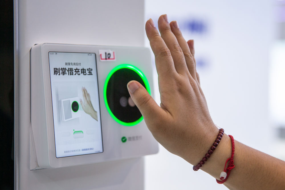 9月4日,在2023智博会腾讯展厅,工作人员演示微信“刷掌”。新华社记者储加音 摄