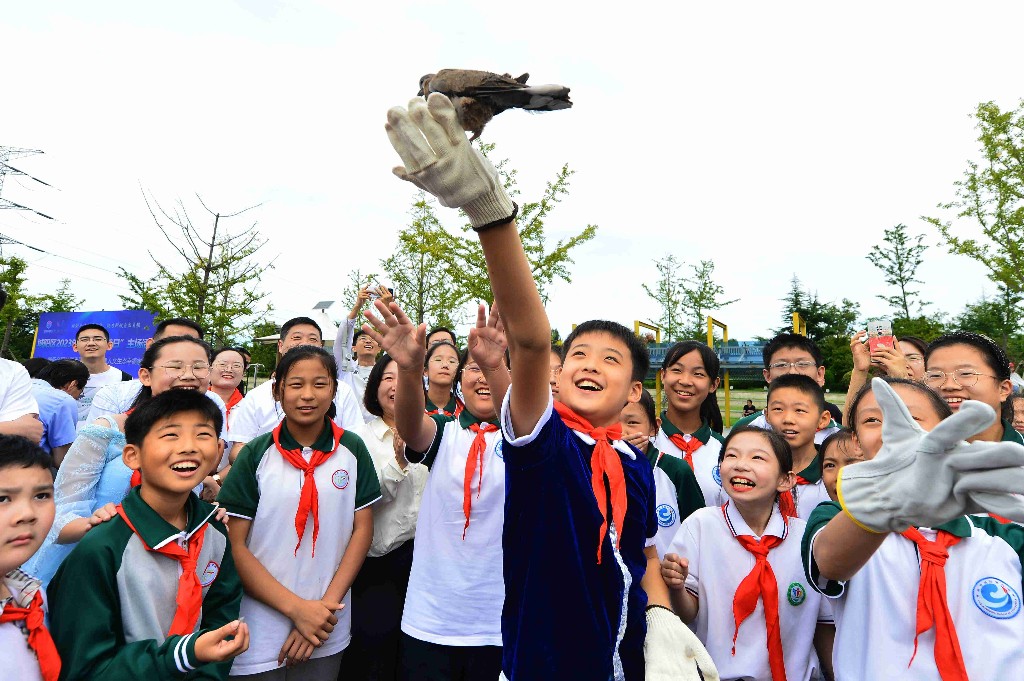 9月21日,在青岛市城阳区举行的“全国科普日”主场活动上,古镇小学的学生在放飞救助的鹧鸪。王海滨 摄
