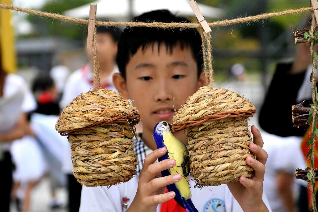 9月21日,在青岛市城阳区举行的“全国科普日”主场活动上,一名小水小学的学生在悬挂手工制作的鸟巢。王海滨 摄