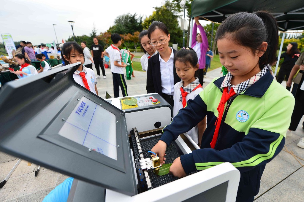 9月21日,在青岛市城阳区举行的“全国科普日”主场活动上,小水小学的学生在制作树叶雕刻。王海滨 摄