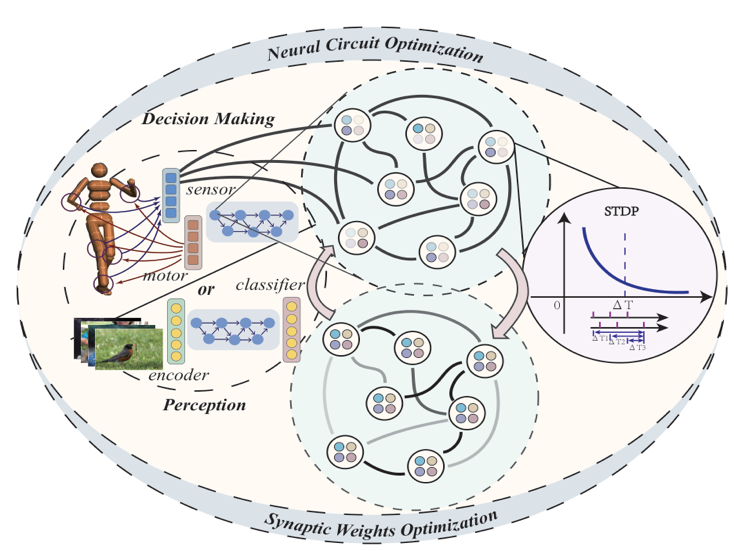 在生物神经系统中,不同类型的神经元能够自组织成连接模式各异的神经环路,以在结构上支持实现丰富的认知功能。人脑中不同类型的神经环路及其自适应能力,促进了人类感知、学习、决策及其他高等认知功能的实现。