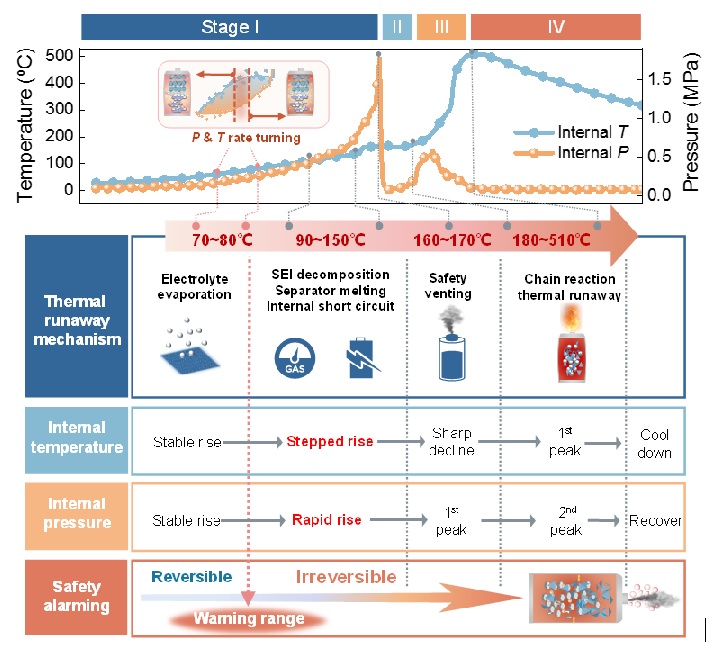 电池热失控制约电动汽车与新型储能规模化发展的核心瓶颈。因此,亟须深入理解锂离子电池热失控演变机制,并提出早期预警策略,以防止火灾爆炸事故的发生。导致电池热失控的根源是电池内部一系列复杂且相互关联的“链式副反应”。从局部短路到大面积短路,电池内部温度快速提升,可高达800℃以上,引发电池起火爆炸。因此,“溯源电池热失控发生的内在诱因,厘清各分步反应之间的耦联关系,揭示热失控主导机制与动力学规律,前移热失控预警时间窗口”是从根本上解决储能安全问题的核心。