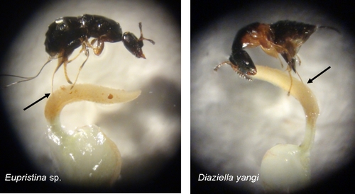 “综合形态特征、雌花期果释放的挥发物,以及交叉放蜂实验等多种方法,结果发现传粉榕小蜂产卵器,比两种榕树的雄树榕果内的雌花花柱都长,表明这种传粉榕小蜂具有在非专性寄主榕树雌花子房内产卵的能力。”论文第一作者、中国科学院西双版纳热带植物园助理研究员黄建峰介绍。