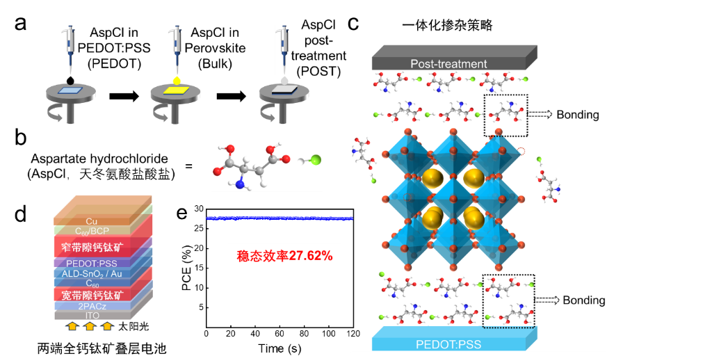 为此,研究团队将天冬氨酸盐酸盐引入到全钙钛矿叠层太阳能电池底部的空穴传输层、钙钛矿体吸光层和上界面层中,开发了一种采用同一分子处理的一体化掺杂策略,极大地改善了钙钛矿薄膜的质量。除了与钙钛矿前驱体配位外,天冬氨酸盐酸盐分子还具有很强的分子间氢键,富集在钙钛矿上、下界面处的天冬氨酸盐酸盐因此充当了钙钛矿层和传输层界面之间的分子锁,进一步提升了钙钛矿材料的性能和稳定性。