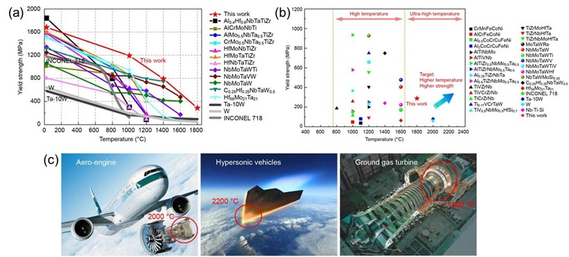 (a)不同温度下合金的强度对比;(b)不同合金最高测试温度及对应强度对比;(c) NbMoTaWHfN难熔高熵合金潜在的工程应用场景