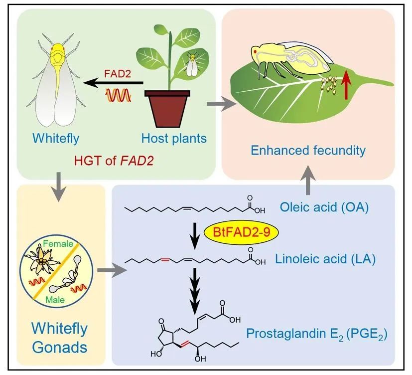 据论文通讯作者、中国农业科学院蔬菜花卉研究所研究员张友军介绍,该成果发现了烟粉虱通过植物源水平转移基因实现自主合成生殖必需营养物质多不饱和脂肪酸,从而进化出强大的生殖能力。该研究在国际上首次报道了植食性昆虫利用植物源水平转移基因参与自身营养物质合成的分子机制,对理解植食性昆虫寄主适应性分子机制提出了新依据。同时,该研究还率先揭示了植物向昆虫转移的功能性水平转移基因作为新一代害虫控制靶标的应用潜力,为害虫精准绿色防控提供了重要的理论依据。