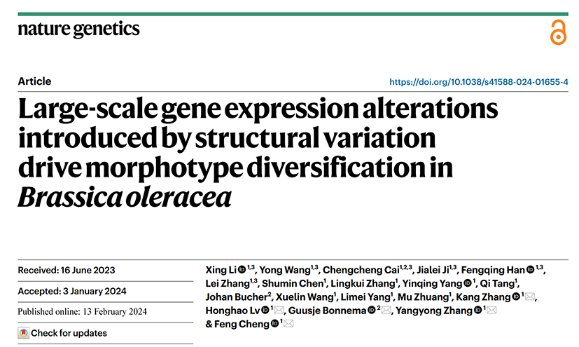 2月15日,记者从中国农业科学院获悉,该院蔬菜花卉研究所蔬菜分子设计育种创新团队和甘蓝类蔬菜遗传育种创新团队,联合荷兰瓦赫宁根大学植物育种系生长与发育团队,构建了高质量的甘蓝泛基因组和图形基因组,揭示了结构变异(SV)是大量基因表达剂量改变的重要调节因子,驱动了甘蓝形态类型多样化的快速驯化,该研究为甘蓝变种形成的驯化机制提供了新的见解。相关成果日前发表在国际期刊《自然·遗传学》上。