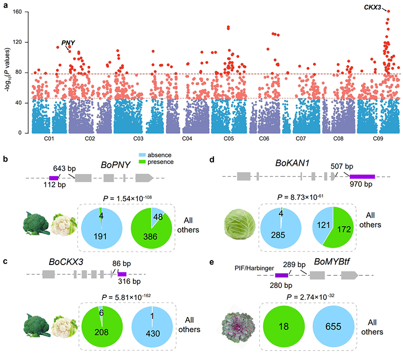 “我们据此选取了22个代表性野生甘蓝和变种材料,利用测序技术,构建了染色体水平的高质量基因组,其序列连续性、着丝粒完整性等与已发表的甘蓝基因组相比显著提升。该研究进一步构建了甘蓝的图形基因组,在700多份甘蓝群体材料中开展变种特异性驯化选择分析,挖掘到一批在不同变种中受到特异性驯化选择的SV及相关基因。”论文通讯共同作者、中国农业科学院蔬菜花卉研究所研究员程锋表示。
