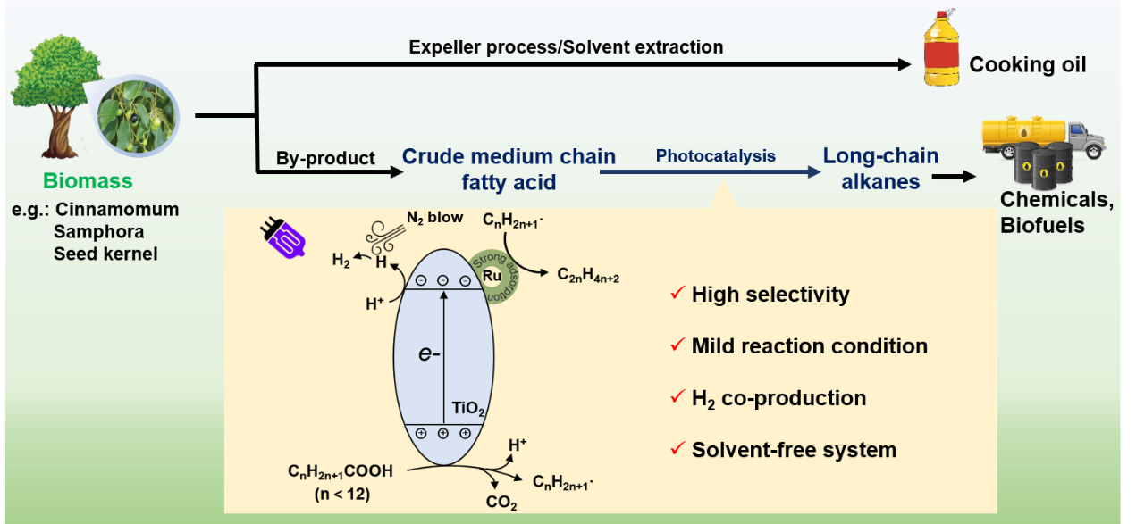 近日,由江西省林科院樟树研究团队与南昌大学化学化工学院合作研究的光催化樟树籽油合成长链烷烃取得重大进展。该研究开发了一种非均相光催化体系,即在Ru/TiO2表面创新性地构建缺氢催化界面,以抑制竞争性烷基加氢反应,实现中短链脂肪酸的选择性脱羧C–C偶联形成长链烷烃,可以获得高达80%的长链烷烃产物,填补了樟树籽油工业应用研究的空白。作为生物衍生脂肪酸升级的有效方法,这种方法具有很好的工业应用前景。