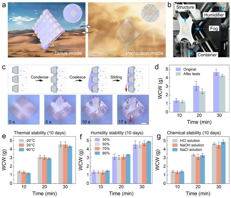 记者2月28日从中国科学技术大学获悉,该校工程科学学院微纳米工程实验室胡衍雷教授和张亚超副研究员团队,创新性地将Janus薄膜的工作模式、保护模式分开考虑,通过拉伸和释放软材料实现亲水微孔-槽通道的裸露与隐藏保护,即工作/保护模式切换。研究成果日前发表于《自然·通讯》。