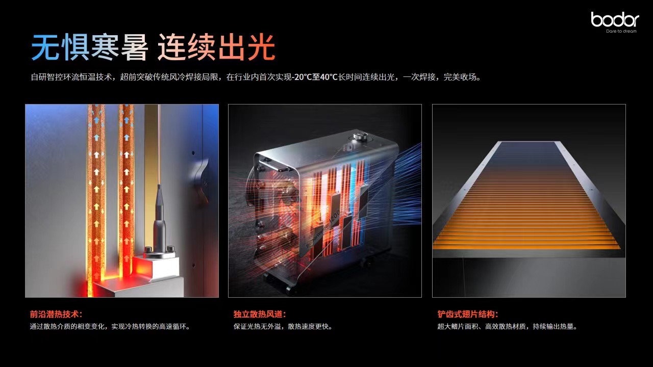 邦德激光产品经理陈超告诉记者,我们自主研发的智控环流恒温技术,能够实现对整机的智能感知和精准温控,确保自冷却手持激光焊运行稳定、连续出光;独立散热风道搭配前沿潜热技术,保证光热无外溢,实现冷热转换的高速循环;散热材质更佳、散热面积更广的铲齿式翅片结构,持续高速对外输送热量。