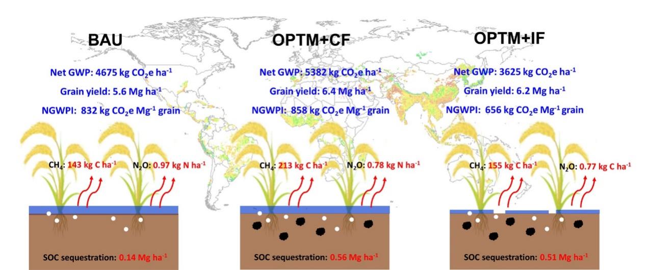 该研究根据全球不同地区的社会经济发展条件,以水稻产量提升为首要目标,建立了相应的有机替代方案。研究发现,与单施化学氮肥相比,全球稻作区采用有机替代方案使水稻产量增加7%,但是甲烷排放大幅度增加,且稻田土壤有机碳增量和氧化亚氮减量不能抵消甲烷激增的增温潜力。