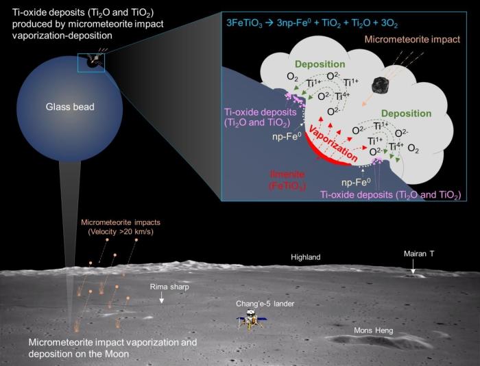 月壤中钛纳米矿物的微陨石轰击成因过程示意图。(中国科学院地球化学研究所供图)