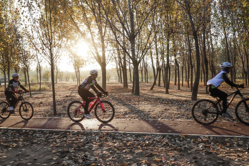 2023年11月1日,在河北省遵化市,骑行爱好者在公园道路晨练。新华社发(刘满仓摄)