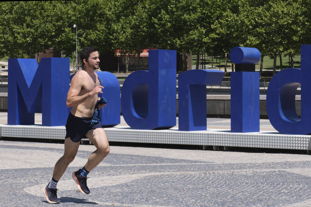 2022年7月20日,一名男子在西班牙马德里曼萨纳雷斯河边跑步。新华社记者孟鼎博摄