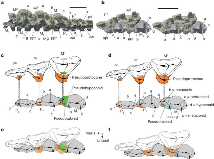 蜀兽牙齿咬合关系及两种牙尖同源性假说:左(c, e)传统认识;右(d, f)新观点(毛方园供图)