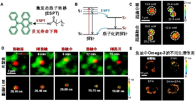 针对脂肪代谢及其相关的动脉粥样硬化过程,研究团队发展了一种激发态质子转移(ESPT)型荧光寿命探针以及影像测量方法。在正常生理状态下,ESPT探针与脂肪酸分子无明显相互作用。在激发态,ESPT探针才可夺取脂肪酸质子产生寿命变化。这样不仅实现了快速可逆响应,而且不影响脂肪酸的代谢和转运等生理过程,为研究活细胞脂肪代谢提供了新手段。
