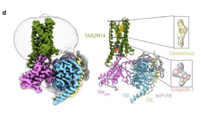 在定义TAS2R14的结构时,研究人员发现,胆固醇促进了它的激活过程。胆固醇与TAS2R14结合后,会使苦味受体处于半活性状态,这样能更容易被苦味分子所激活。此外,由肝脏分泌的胆汁酸同样可与TAS2R14结合,其化学结构与胆固醇相似,也能结合到TAS2R14的正构位点中。