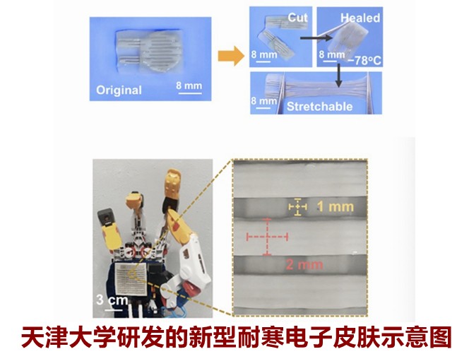记者5月23日从天津大学获悉,该校化工学院张雷、杨静团队成功研发出新型电子皮肤。这种皮肤可在零下78摄氏度的严寒环境中,实现机器手的高拉伸、自愈合和高灵敏功能,对我国开展极地科考具有重大意义。相关成果近日发表于国际期刊《美国化学会志》。