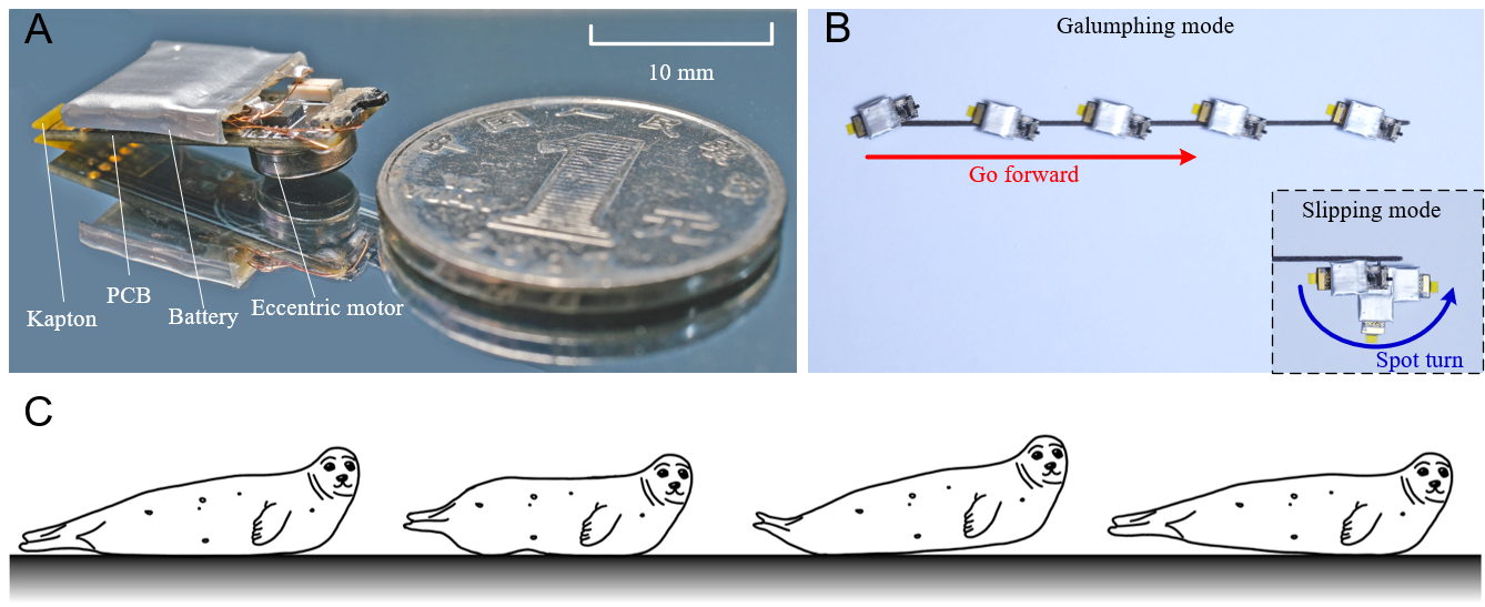 “我们的灵感来源于海豹踱步跳动方式。”李兵解释,这种方法可以让单一电机驱动的刚体机器人实现直行、弧行、转向等灵活运动。