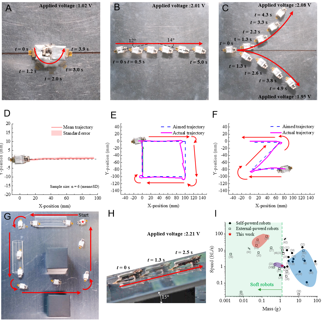 科研团队发现,微观运动的周期特性改变,直接影响机器人的宏观运动轨迹。因此科研团队通过改变驱动电压,调节电机产生偏心转速,从而控制机器人形成不同宏观轨迹。