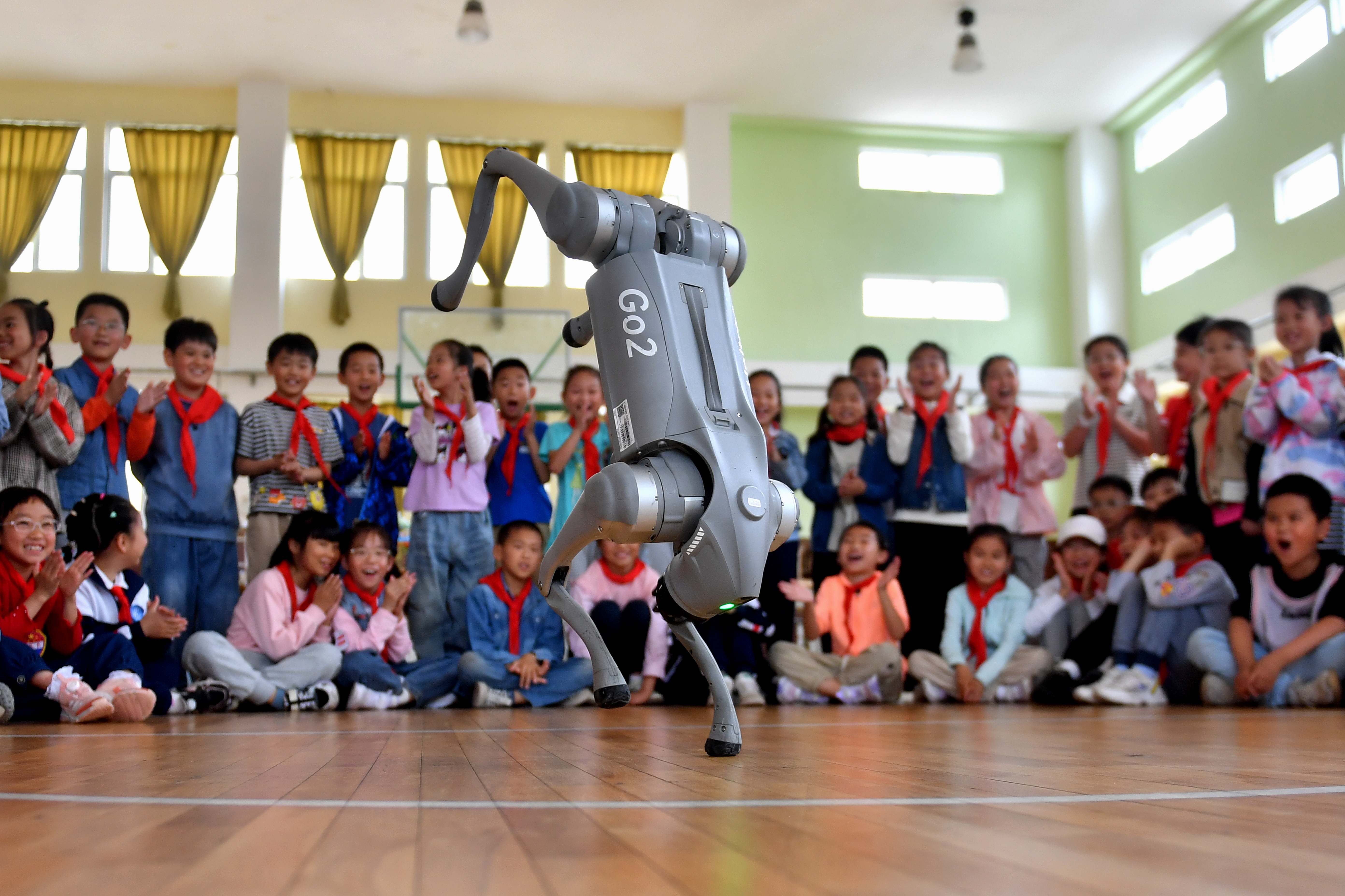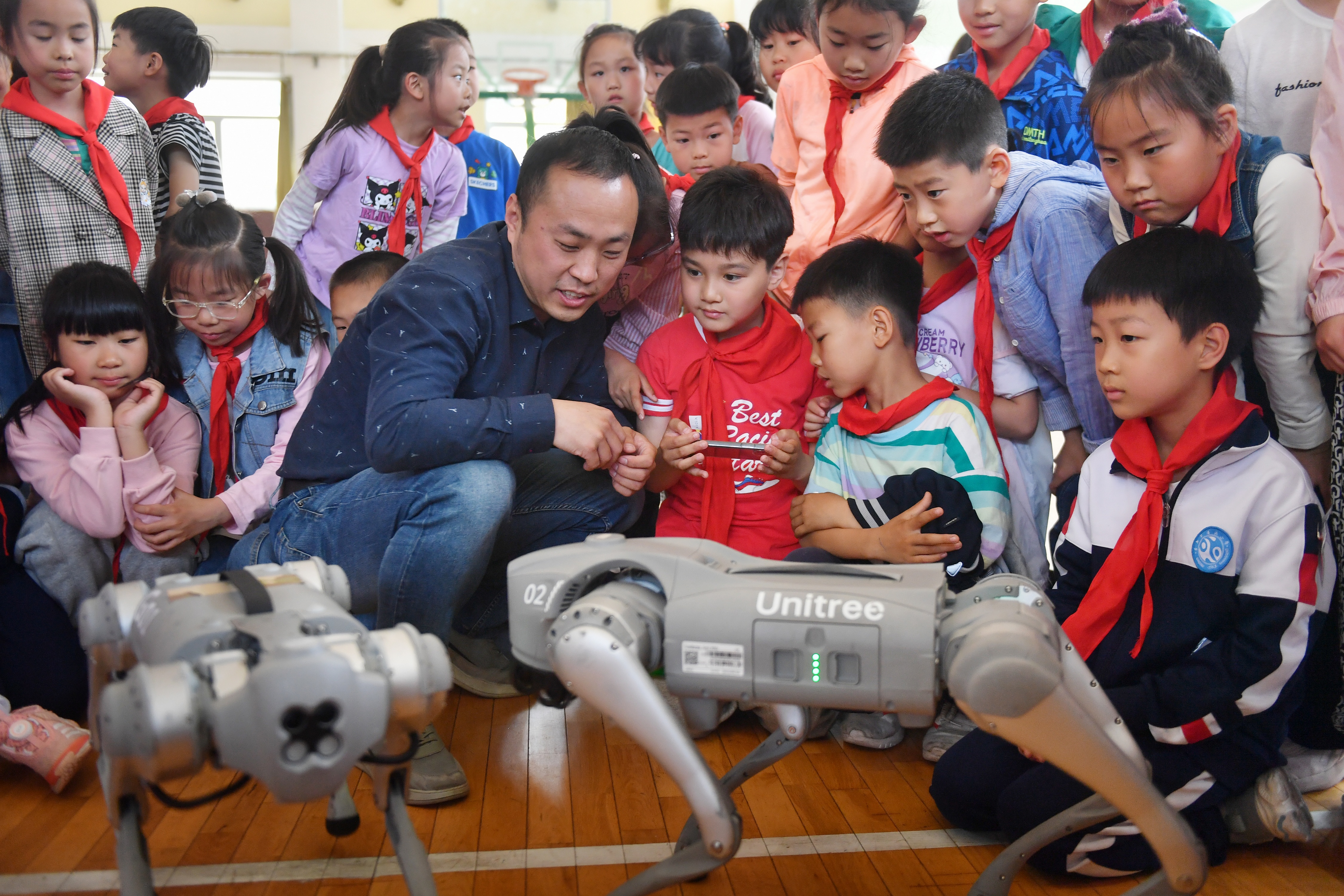 5月30日,青岛市市北区上清路小学的学生们观看仿生机器狗表演。王海滨 摄