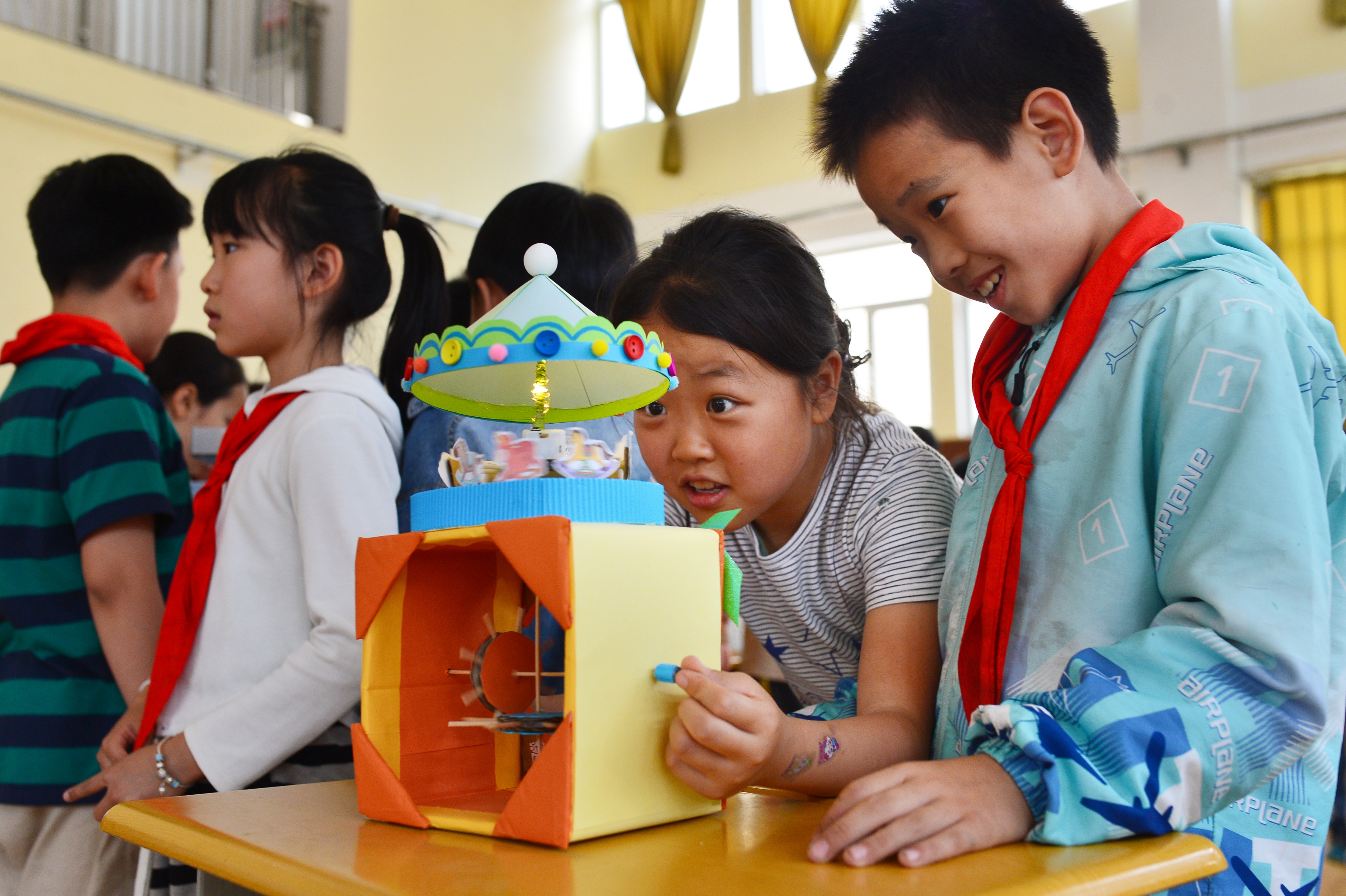 5月30日,青岛市市北区上清路小学的学生们观看手工制作的电动旋转木马。王海滨 摄