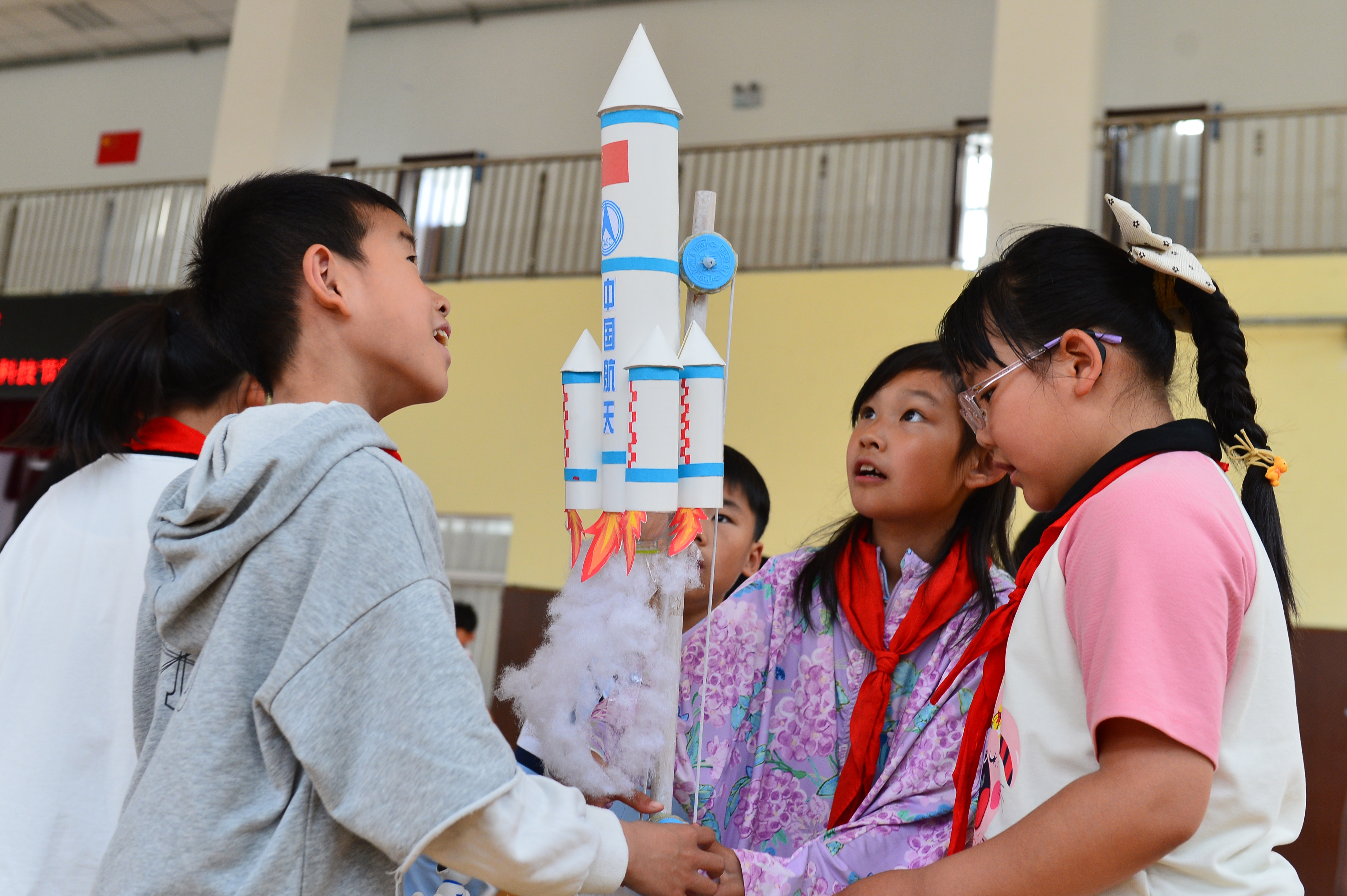 5月30日,青岛市市北区上清路小学的学生们体验制作中国航天模型。王海滨 摄