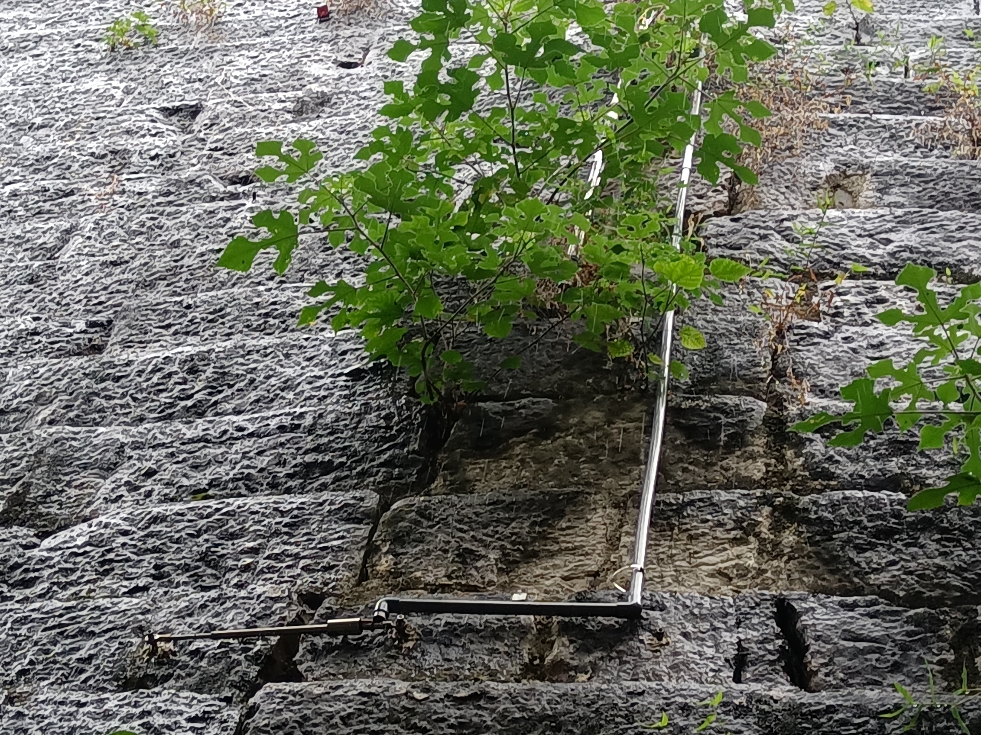 跟随南京城墙监测预警中心数据采集专员田野步行至南京中华门城堡旁的赤石矶登城口,只见一条长约5米的细长管线从城墙顶部紧贴着城砖垂落下来,在它旁边,还有一根细细的金属管,附着在相邻的两块城砖上。