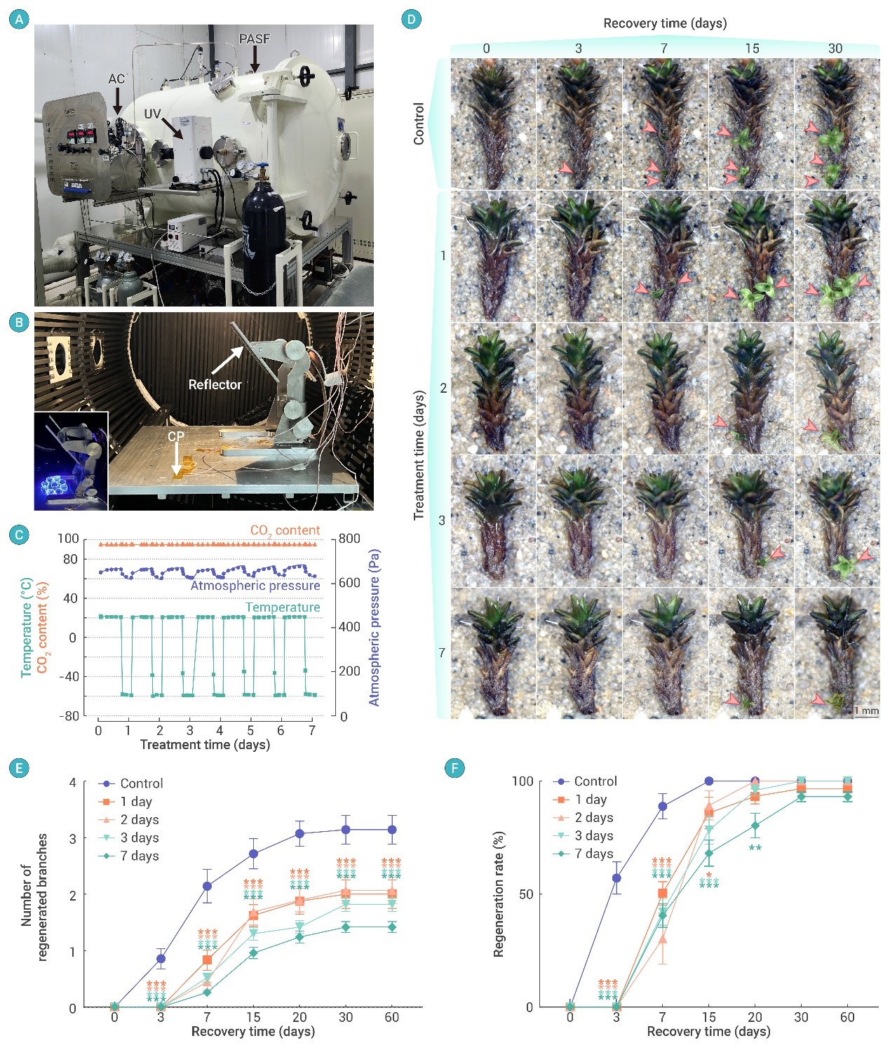 研究还发现,在复合多重逆境的火星模拟条件下,该藓仍能存活并在恢复适宜环境后再生出新的植株。