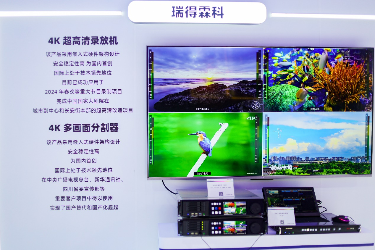 值得注意的是,三大展区展出了多项“首个”与“首创”的超高清视听技术。比如,瑞得霖科带来的国内首创嵌入式4K超高清录放机、国内首创嵌入式4K多画面分割器;数码视讯推出的业内首套基带IP化解决方案等。