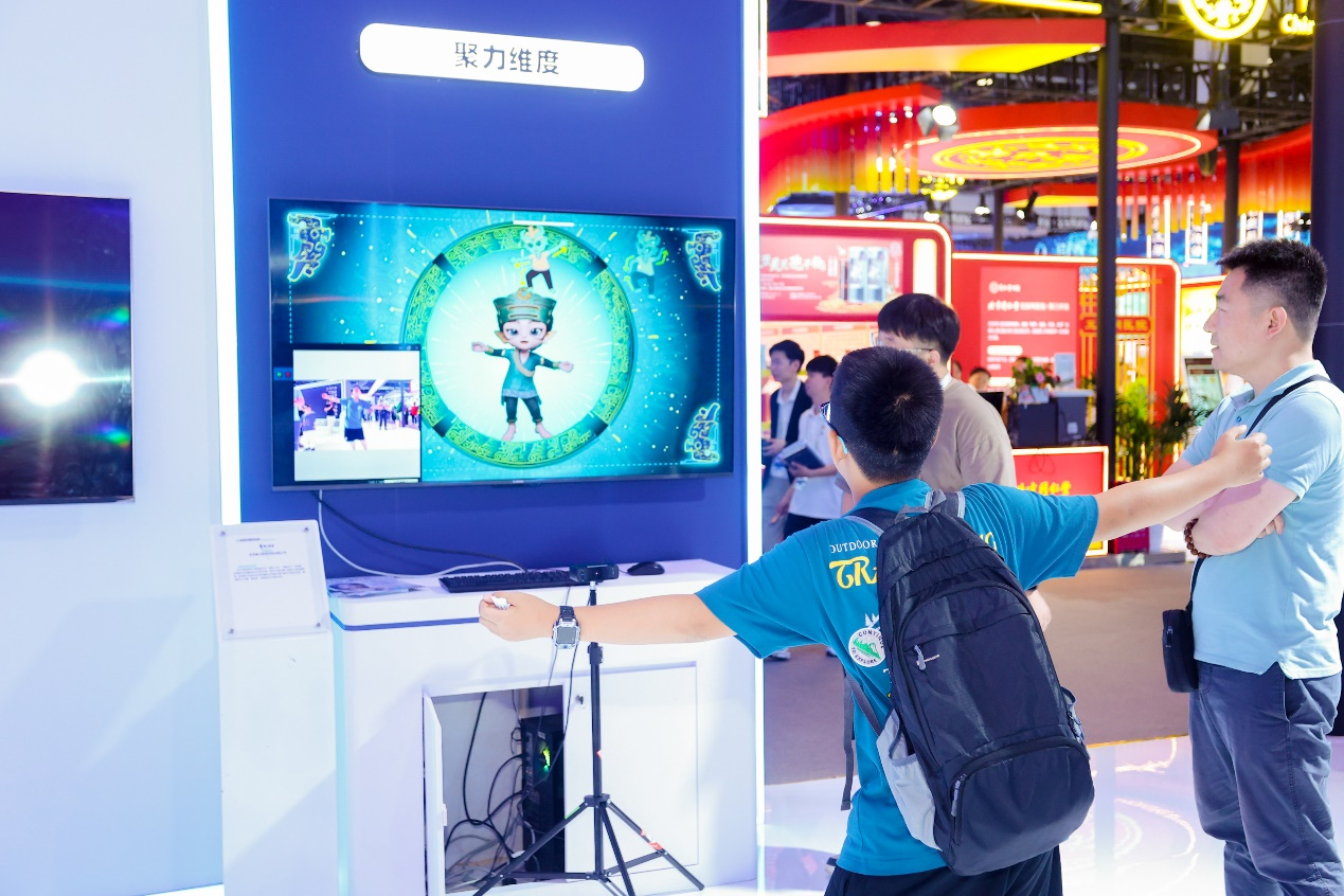 聚力维度通过打造的“蜀堆堆互动”,不去成都、无须任何穿戴设备,就能和三星堆文化进行一场实时交流。该项目采用了单目摄像头捕捉技术,不借助设备就可以精准捕捉面部及全身肢体动作,实现用普通摄像头达成和百万级动捕设备同等的捕捉效果。许多小朋友在家长的陪同下,跟着屏幕和“蜀堆堆”共舞。