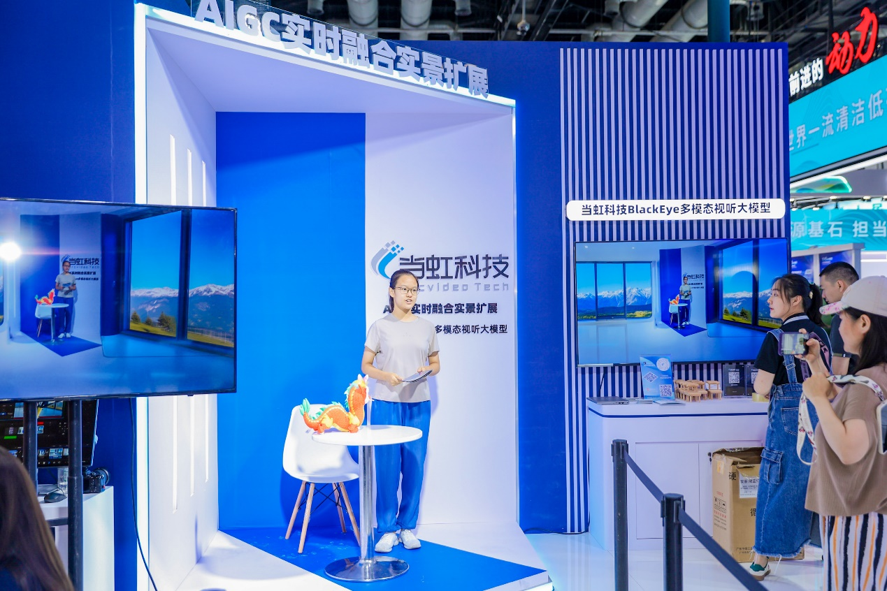 当虹科技展出了广电领域首个AIGC融合实景扩展技术,该技术基于自研的BlackEye多模态视听大模型,可以结合现有环境,进行实时画面融合和延伸,也可以直接生成一个新的虚拟环境。目前,在中央广播电视总台央视财经落地应用,是该技术在中国广播电视领域的首次应用。