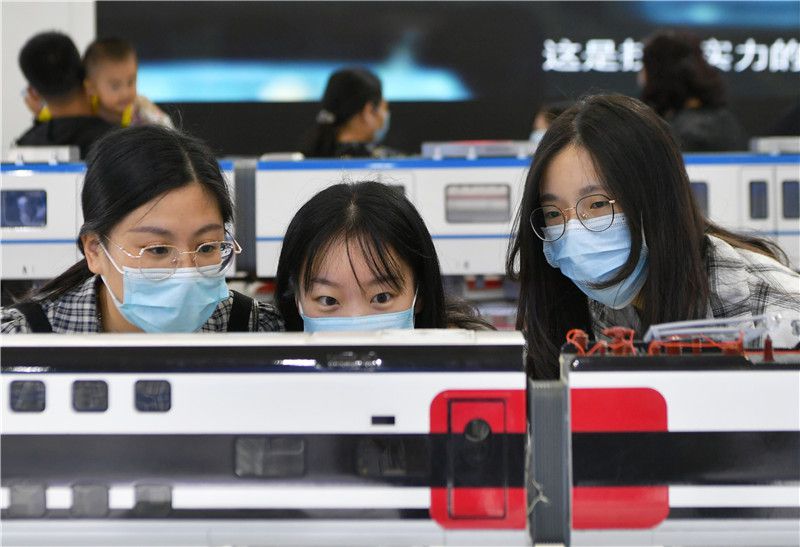10月14日,观众在数字中国建设成果展览会现场观看可变编程动车组模型。