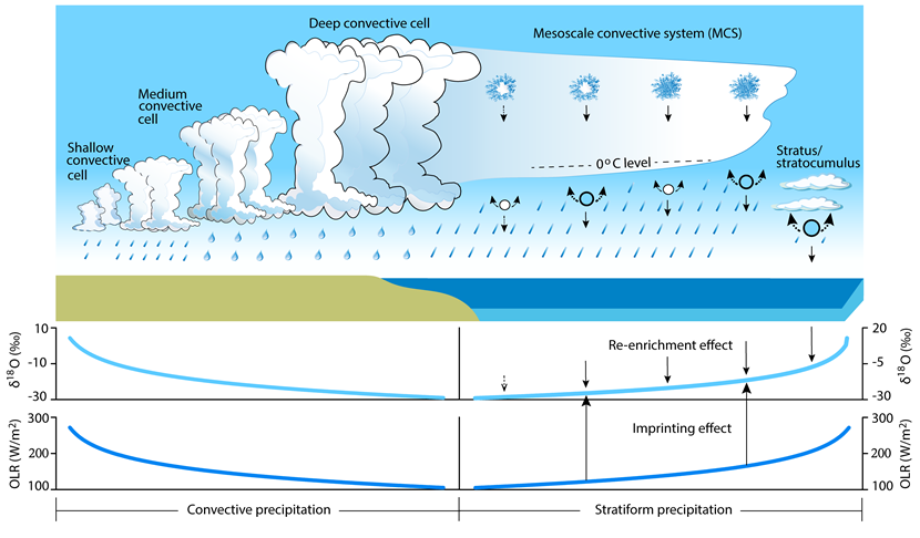 在最新的研究中,科研人员发现,降水稳定同位素与层状分数呈现非常微弱的负相关,但与对流强度始终保持显著的正相关。
