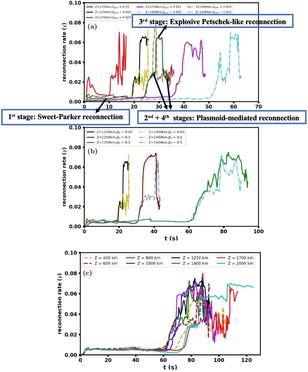 云南天文台研究员倪蕾、林隽和阿卜杜拉-扎法尔博士等人另辟蹊径,聚焦太阳低层大气这一特殊环境,利用单流体辐射磁流体力学模拟技术,深入研究了从光球到日冕底部不完全电离区域的动态磁重联过程。他们发现,在这一环境中,磁重联过程并非一成不变,而是会经历从等离子体团不稳定性主导的磁重联到爆发式的动态佩切克式磁重联的转变。