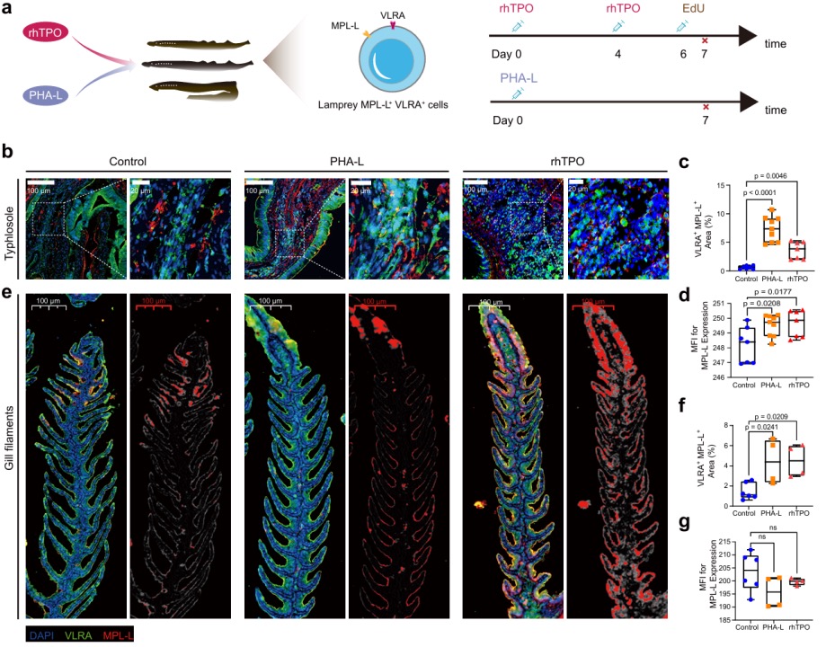 邵长伟团队通过绘制东北七鳃鳗的免疫组织细胞图谱,鉴定了包括T样细胞和B样细胞在内的多种免疫细胞类型。对淋巴样细胞亚群进行进一步分析后,研究人员发现了一种特异表达血小板生成素受体的T样细胞亚群,这种细胞在七鳃鳗的肠道和血液大量富集,表达造血相关基因,与其他T样细胞亚型存在显著异质性。