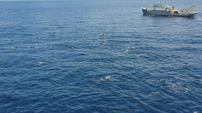 “第七次南海深潜/远海鲸类科考航次”科研人员在南海海域记录到的弗氏海豚画面。