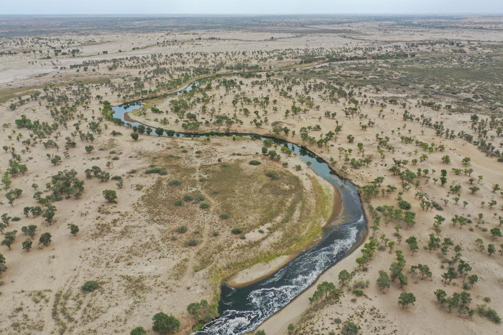 8月12日,大西海子水库生态输水开闸放水,水流经塔里木河下游生态胡杨林(无人机照片)。新华社记者 丁磊 摄