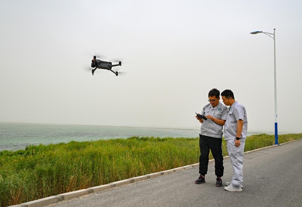 8月11日,工作人员在输水前在大西海子水库大坝上利用无人机巡库。新华社记者 陈朔 摄