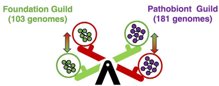 《细胞》论文中的跷跷板模型配图。左为103个基石功能群基因组,右为181个病生功能群基因组。