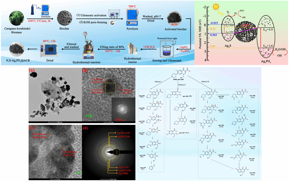 10月14日,记者从西安建筑科技大学获悉,该校交叉创新研究院修复生态学石辉教授团队以活化生物炭(ACB)为载体,通过水热反应联合化学共沉淀法,研发出新型氮硫共掺杂生物炭基磷酸银复合光催化剂(N,S-Ag3PO4@ACB),对高浓度诺氟沙星表现出高效去除效果。相关成果近日发表在《自然》旗下期刊《npj 清洁水》上。