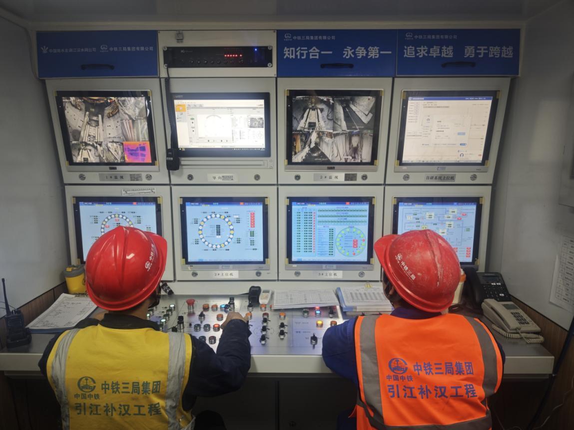 引江补汉工程土建2标,工作人员在“江汉平安号”TBM掘进驾驶室实时观察各项数据。